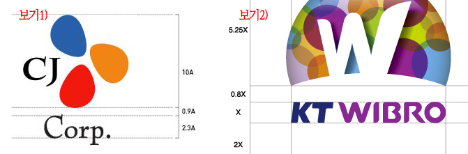 그러니까 CJ마크의경우 로고 높이가 10배라면 간격은 0.9배 타이포는 2.3배로 쓰라는 예기이지요.