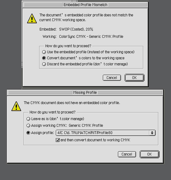 그런데도 색감차가 많이나는 것을 줄이기 위한 방법으로 모니터 to 인쇄 잉크 색감으로 변환할때 유사치 색으로 변환이 되도록 도와 주는 것이 프로화일(CMYK Pro File) 입니다. 지금 위에 메세지를 토대로 보면 바로 이 색을 보완하기 위하여 지정해야할 프로화일 지정이 제대로 되어있지 않다는 메세지 입니다.